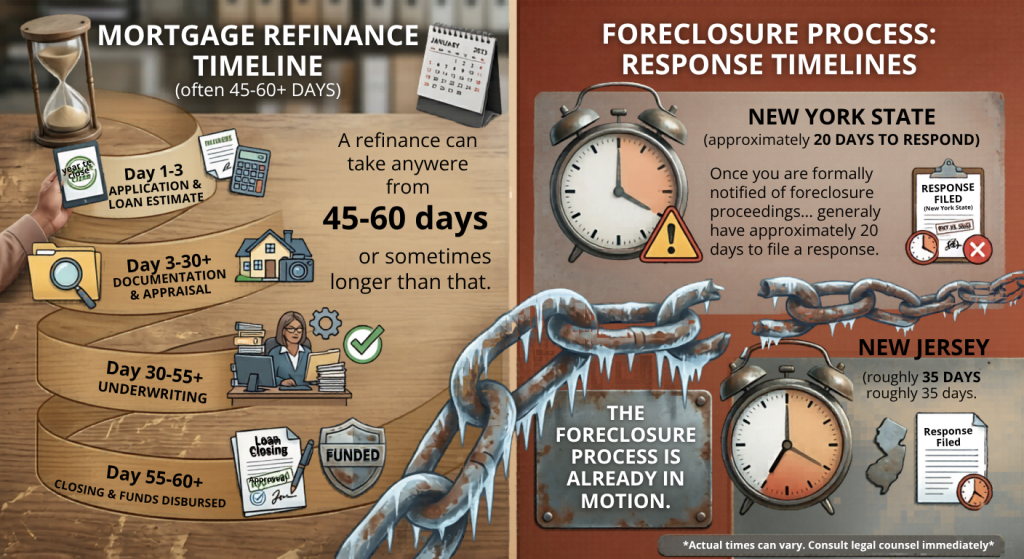Time seems like it isn’t pressing — until it is. A refinance can take anywhere from 45-60 days or sometimes longer than that. However, the Foreclosure process is already in motion. In New York state, for example, once you are formally notified of Foreclosure proceedings you generally have approximately 20 days to file a response. In New Jersey, it is roughly 35 days.