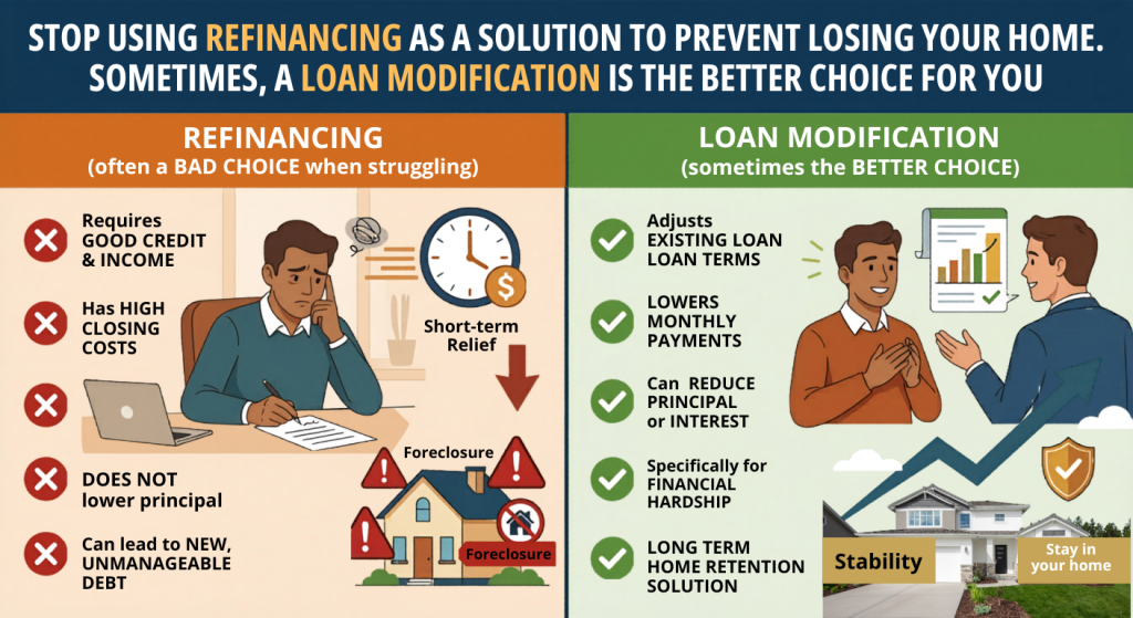 Maybe you’re a homeowner who has fallen behind on your mortgage payments. It’s normal to want to find a quick solution. One common approach is to refinance. Lower monthly payments. Reset the loan. Fix the issue.